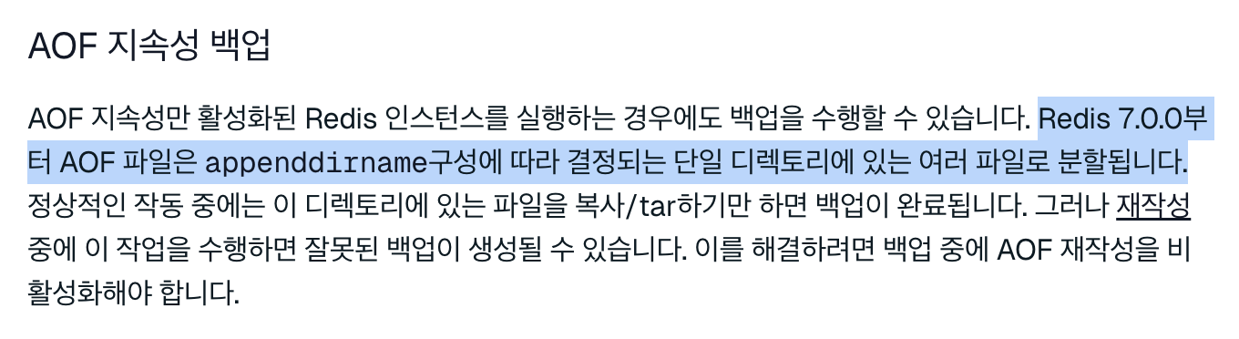 Redis 7.0.0 버전부터는 AOF 파일이 한 디렉토리에 안에 여러 파일로 분할되어 저장되는 것 같다.
