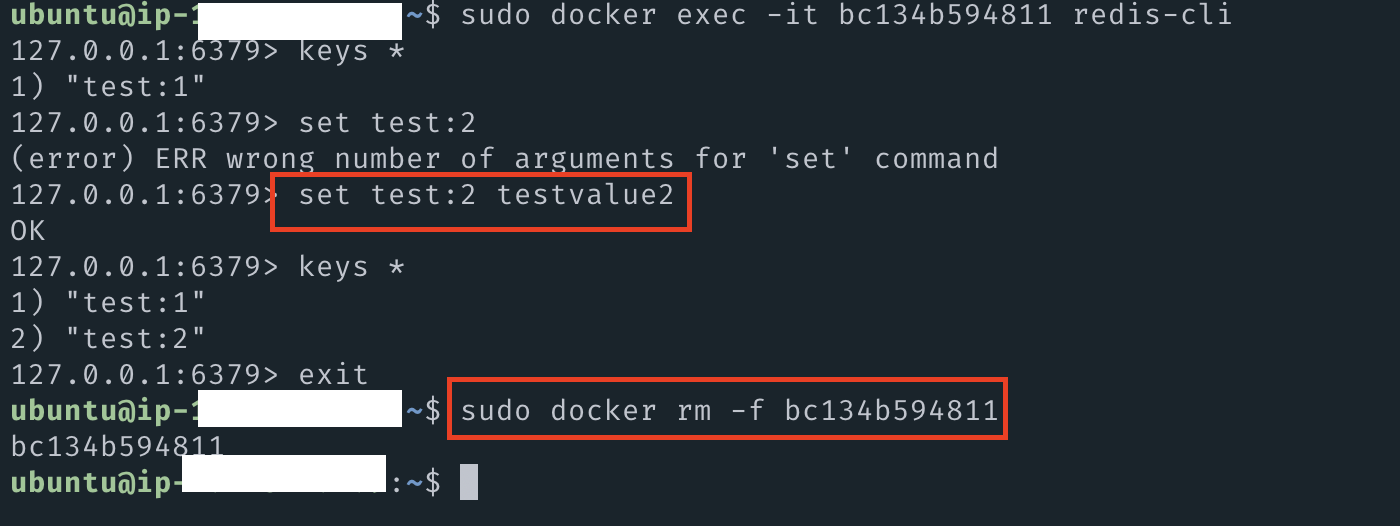 이번엔 "test:2"라는 키값을 하나 더 추가하고, rm -f 명령어로 컨테이너를 강제로 지운 뒤 다시 실행시켜봤다.