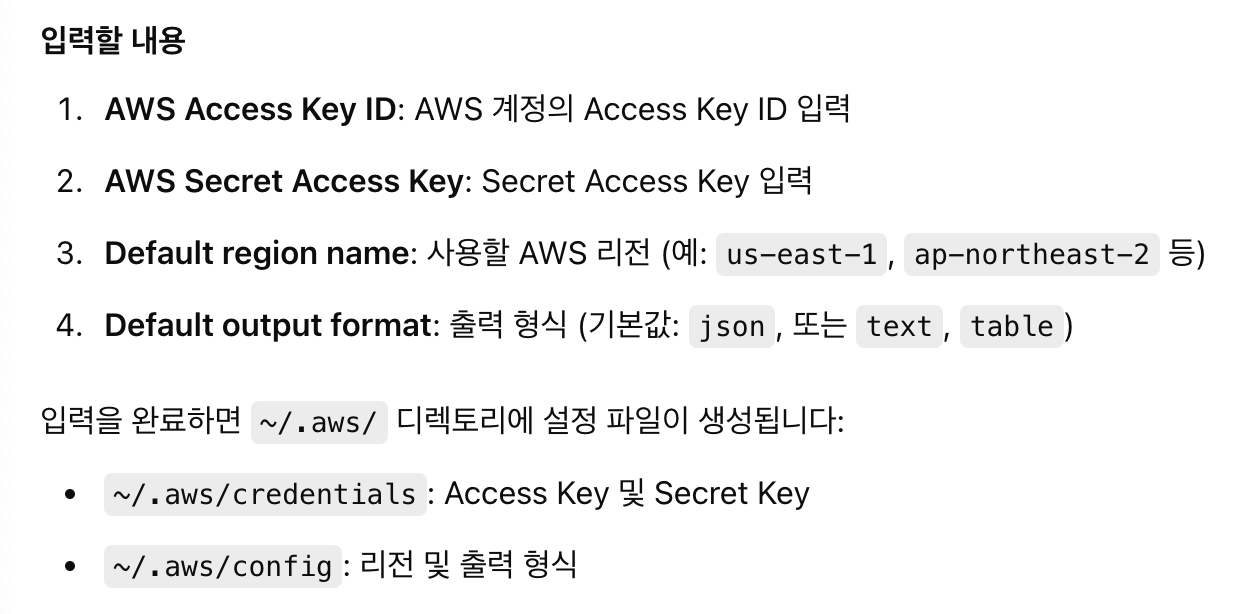 aws-cli를 구성하기 전에, IAM 계정과 이에 접근하는 액세스키가 없다면 만들어주어야합니다.