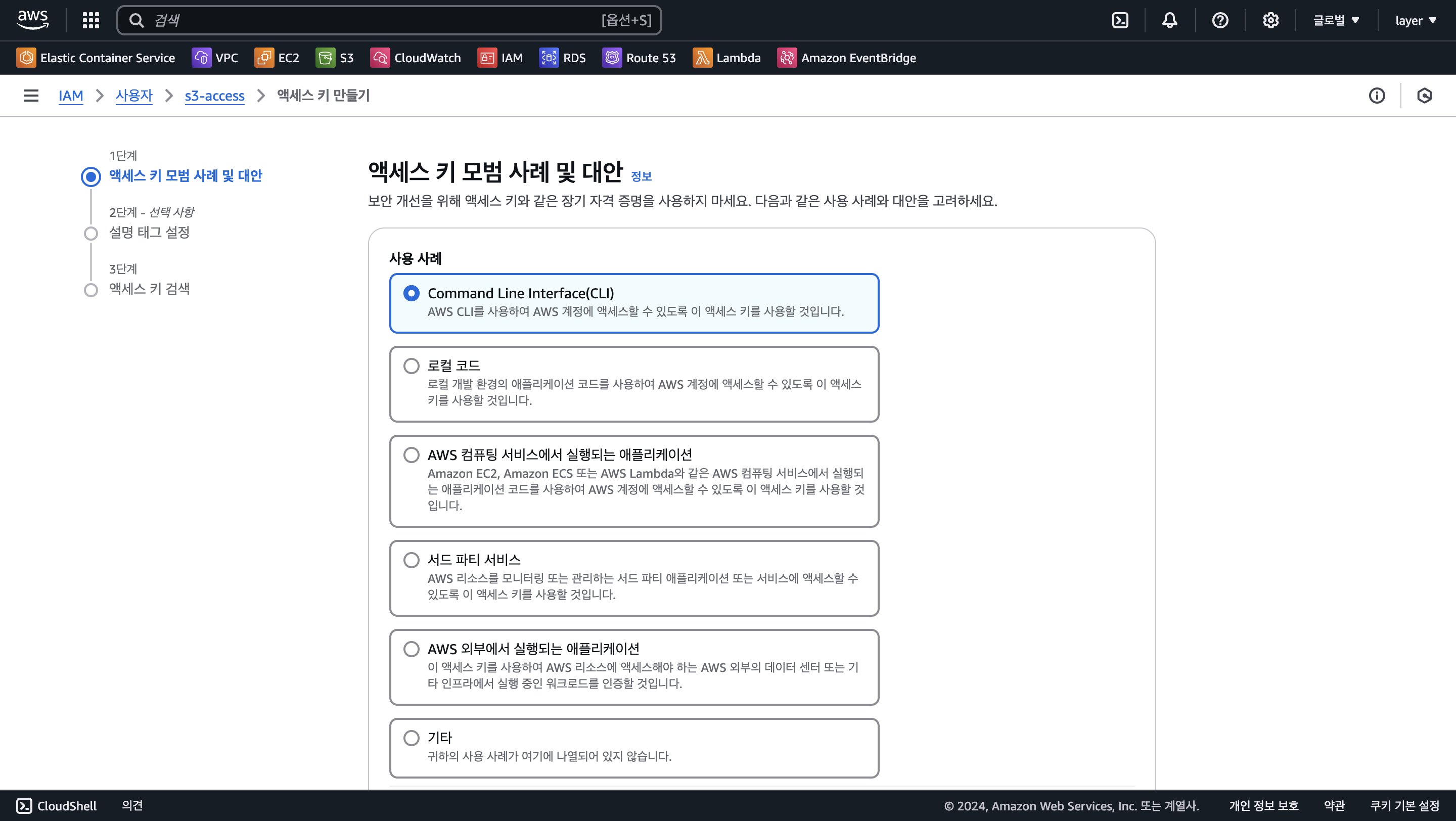 CLI를 위한 계정을 만들고 있으므로, 사용사례 맨 위에 있는 Command Line Interface(CLI)를 체크해줍니다.