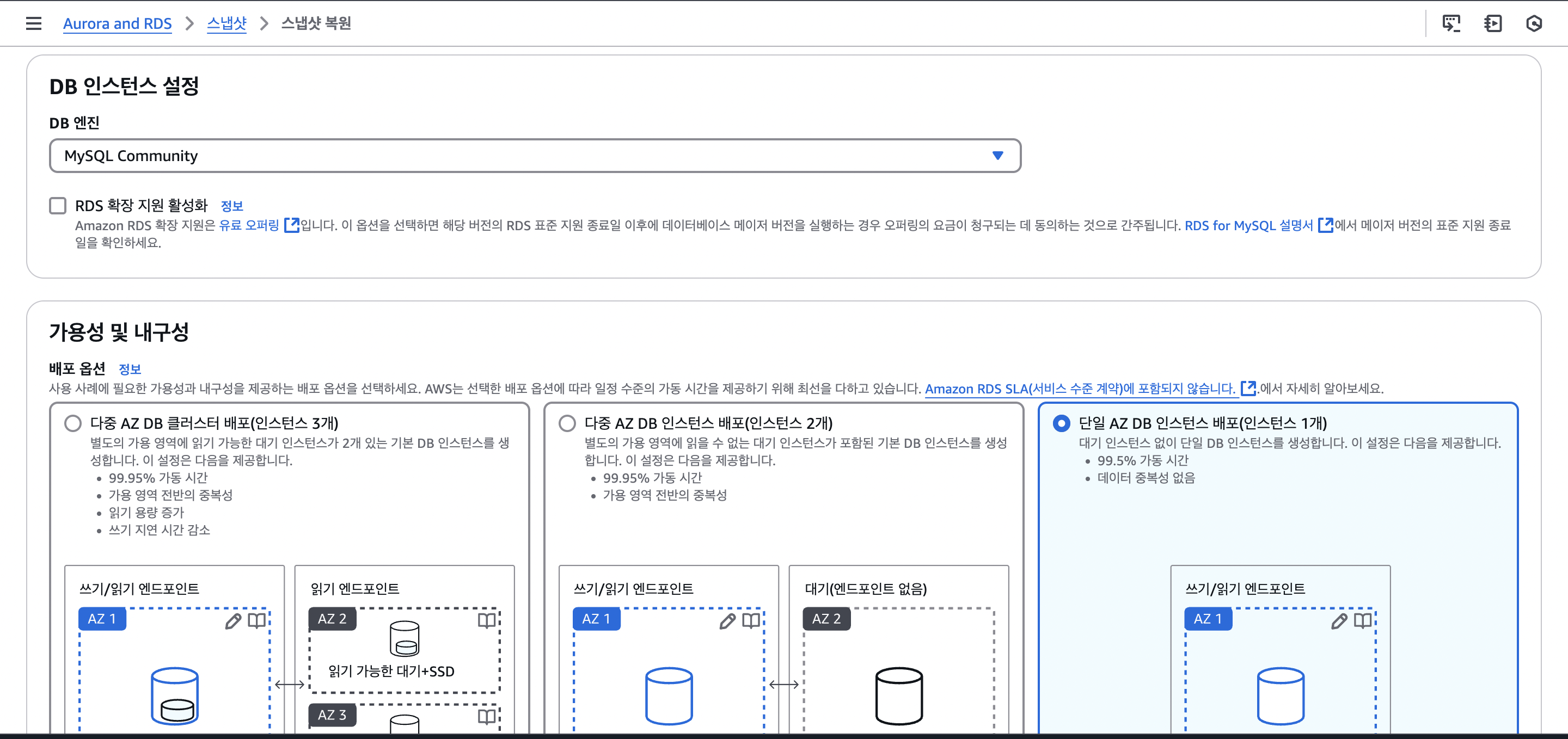 스냅샷으로 복원할 때도 DB 인스턴스를 처음 만들때와 마찬가지로 배포 옵션, 연결 등 설정들을 해주어야한다.