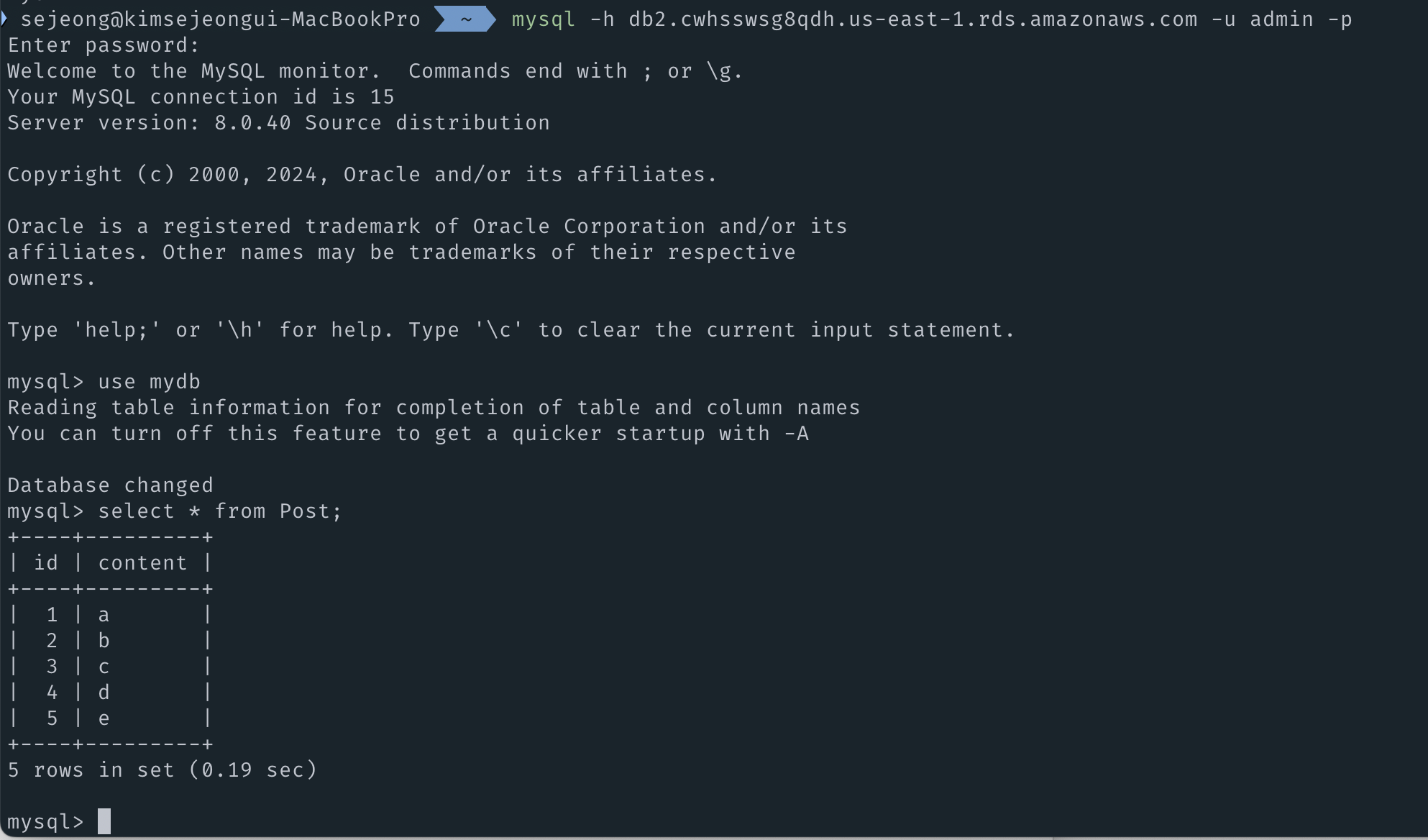 새롭게 만들어진 인스턴스(사진에서는 db2)에 접근해 확인해보면, 스냅샷을 생성했던 시점의 데이터들이 들어있는 것을 확인할 수 있다.