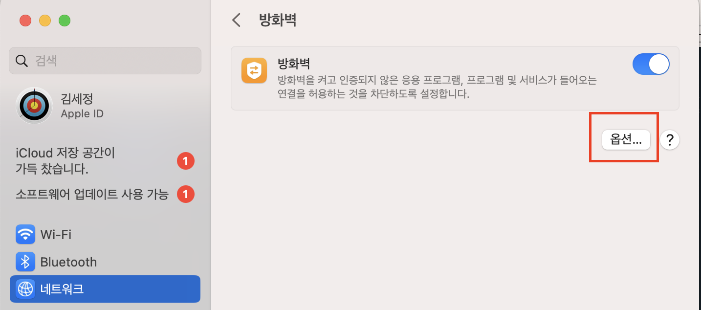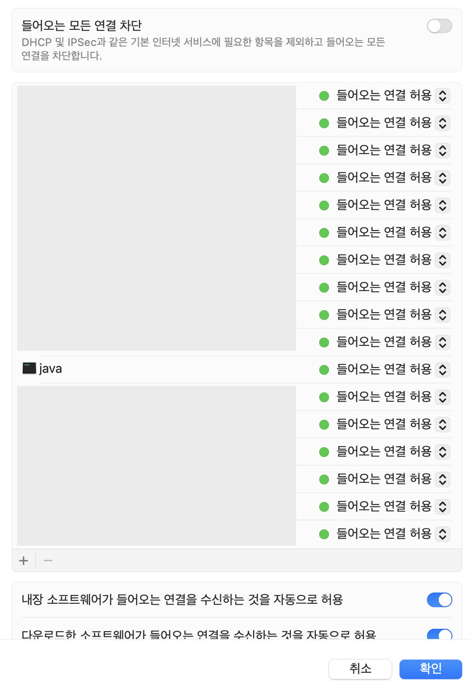 설정 -> 네트워크 -> 방화벽 -> 옵션 클릭 -> "+" 버튼 눌러 사용하고 있는 java의 실행 파일을 등록