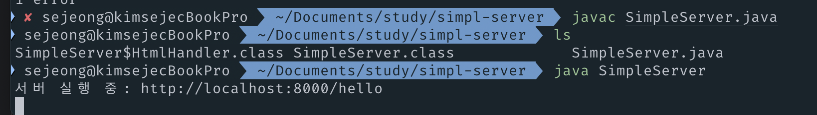 중요한 점은, 맥에 java가 여러개 설치되어 있다면 SimpleServer.class 파일을 실행할 때 사용한 java를 등록해주어야 한다는 것이다.