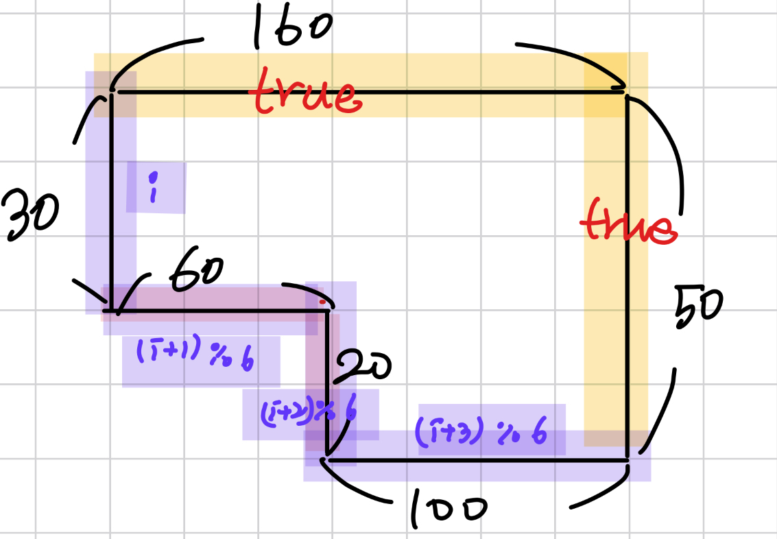 그런 i를 찾으면, (i+1)%6, (i+2)%6의 두 변이 작은 직사각형의 변이 됩니다.