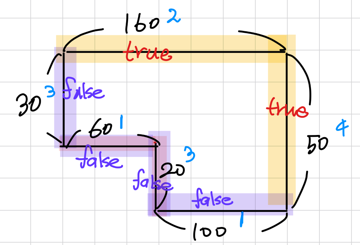 // 작은 직사각형의 변 구하기 -> vis가 4연속 false라면, 가운데에 있는 두 변이 작은 직사각형의 변이다.