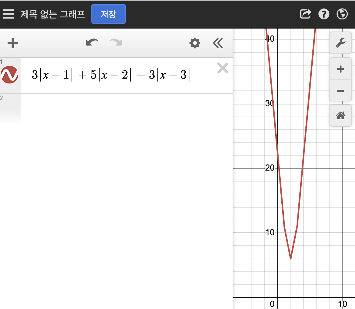 (2 <= x < 3): (3 + 5) - (3) => 기울기의 부호가 바뀌는 부분