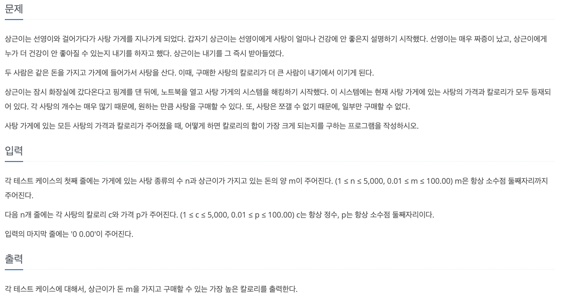 위 과정을 거치면 dp[n][m]에 들어있는 값이 m원을 썼을 때 살수 있는 사탕의 최대 칼로리 수가 됩니다.