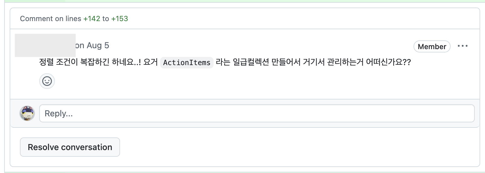 그 당시 기획이 핀 여부와 status에 따라 정렬 순서가 바뀌는 방식이었기 때문에 위와 같은 복잡한 로직이 나왔는데, 저는 그 당시 해당 코드를 그대로 Service 클래스에 넣어놓은 채로 PR을 보냈고, 팀원분께서 아래와 같은 리뷰를 해주셨습니다